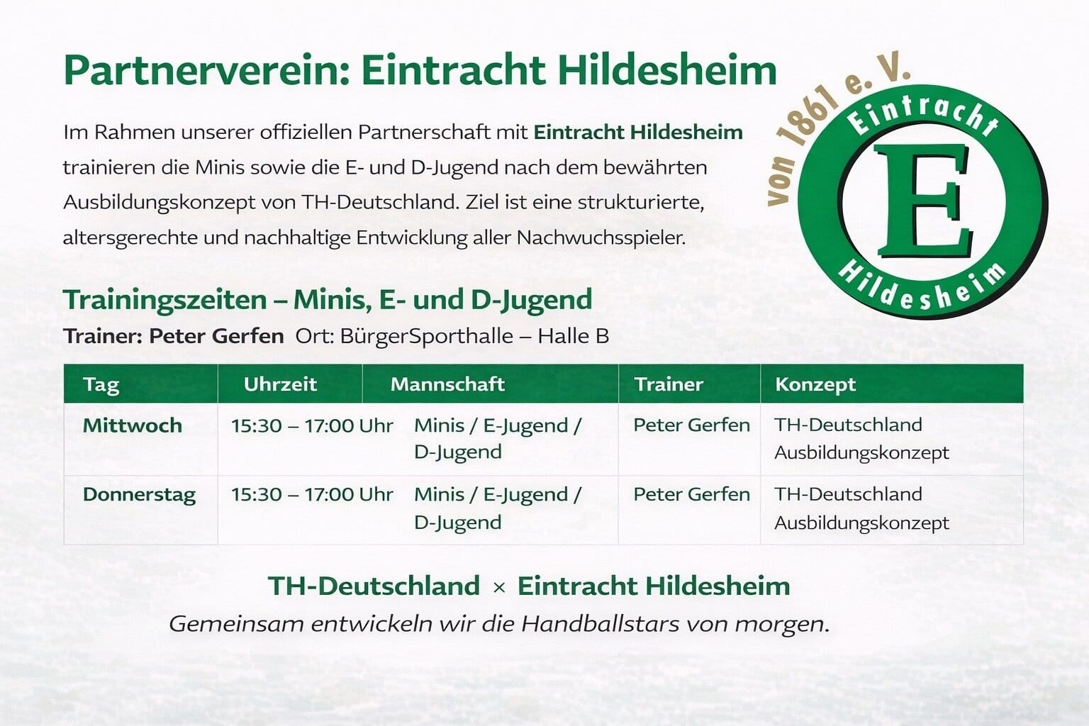 Im Rahmen unserer offiziellen Partnerschaft mit Eintracht Hildesheim trainieren die Minis sowie die E- und D-Jugend nach dem bewährten Ausbildungskonzept von TH-Deutschland. Ziel ist eine strukturierte, altersgerechte und nachhaltige Entwicklung aller Nachwuchsspieler.